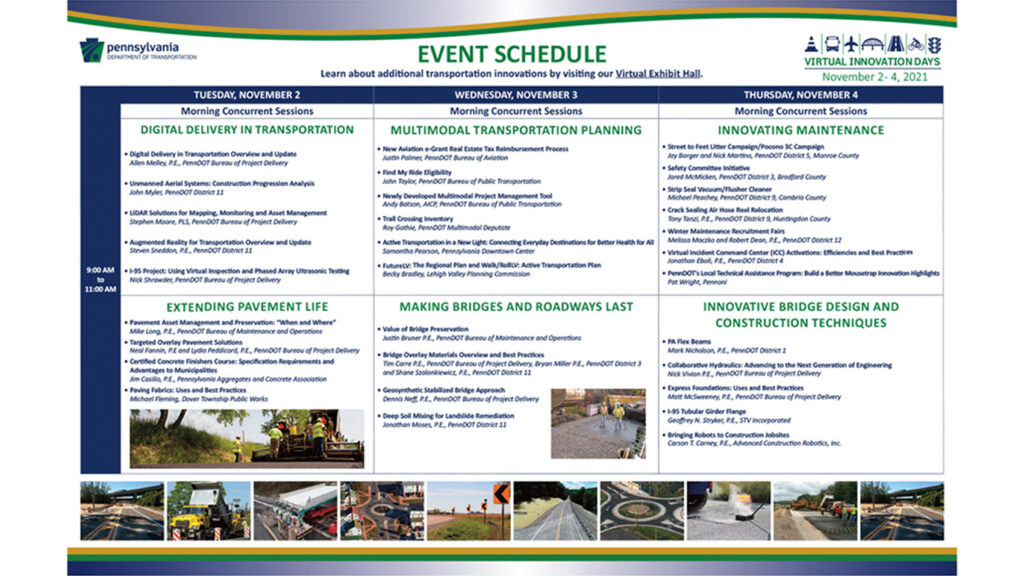In 2021, the COVID-19 pandemic continued to change the way transportation projects and agencies conducted business. Stokes, along with Pennoni and KCI Technologies, were tasked to assist in planning and facilitation support for the Virtual Innovation Days event that took place November 2–4, 2021, planned and hosted by PennDOT Bureau of Innovations (BOI) in lieu of the previous, in-person innovation events.